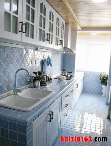 本套房屋装饰风格属于地中海风格,澄澈透明的浅蓝色加上洁净的白色,自然是可以带给人们一种清新感,素净的色彩搭配可以为人们提供一个宁静、舒适的休息空间,客厅中淡蓝色带有花纹图案的壁纸搭配上白色的石膏线条可以将地中海的静谧感全部都展现出来,靠墙而放的一组浅蓝色布艺沙发,使用了柔软的布料,搭配上同一色系的抱枕,更是可以带给人们一种舒适感,中间一款实木材质的茶几,虽然造型简单但其柔美的曲线以及精细的做工更是可以展现出其设计感,地面上并没有选用地板进行铺设,而是使用了具有仿古特色的小地砖,与房间的整体装饰搭配在一起显得更加新颖,可以带给人们一种自然的舒适感。