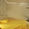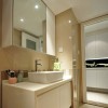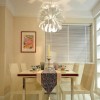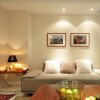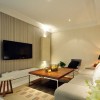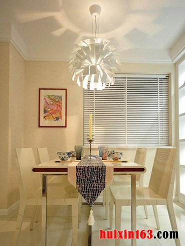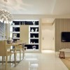 本套房屋设计中客厅中的装饰比较简约但并不失个性,电视背景墙上使用了带有竖条纹图案的壁纸做装饰,两侧凸起的墙壁造型上镶嵌了射灯做设计,平顶式的石膏板吊顶上并没有多余的装饰,只是安装了几组小巧却又明亮的射灯,一款白色的布艺沙发上并没有艳丽的色彩做点缀,简单、大方的设计可以带给人们一种舒适感,沙发中间摆放了一款实木材质的茶几,四周的边角框则使用了金属材质,上下两层的设计可以为客厅增加收纳空间,是非常实用的设计,比较符合本套房屋装饰的重点,沙发的一角处摆放了新鲜的花束,不仅可以使客厅中充满花香,更可以为客厅空间增添一丝温馨之意。
