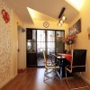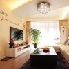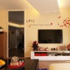 本套案例的设计比较使用与新婚夫妇居住,可以当做婚房,一进到客厅人们首先感觉到的应该就是满满的温馨感,淡黄色的墙壁加上柔和的灯光自然会使客厅空间显得非常温暖,电视背景墙上使用了简单的墙壁贴画做装饰,没有复杂的造型却也能设计出充满个性的墙壁,石膏板吊顶做了别致的造型设计,中间则安装了一盏圆形的吸顶水晶灯饰,水晶吊坠晶莹剔透但并不会让人们感觉到夸张,反而会使客厅空间萌生更多的时尚感,落地窗前悬挂了一套带有碎花图案的窗帘,窗帘由窗纱以及布艺窗帘组合而成,白色的窗纱可以使客厅空间增加一丝朦胧感,而碎花图案的布艺沙发则更是为客厅增添了一份浪漫之意。