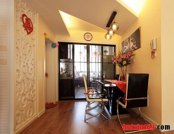 本套案例的设计比较使用与新婚夫妇居住,可以当做婚房,一进到客厅人们首先感觉到的应该就是满满的温馨感,淡黄色的墙壁加上柔和的灯光自然会使客厅空间显得非常温暖,电视背景墙上使用了简单的墙壁贴画做装饰,没有复杂的造型却也能设计出充满个性的墙壁,石膏板吊顶做了别致的造型设计,中间则安装了一盏圆形的吸顶水晶灯饰,水晶吊坠晶莹剔透但并不会让人们感觉到夸张,反而会使客厅空间萌生更多的时尚感,落地窗前悬挂了一套带有碎花图案的窗帘,窗帘由窗纱以及布艺窗帘组合而成,白色的窗纱可以使客厅空间增加一丝朦胧感,而碎花图案的布艺沙发则更是为客厅增添了一份浪漫之意。