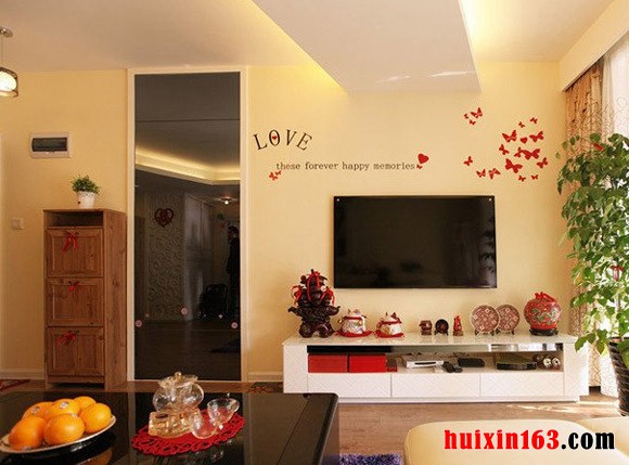 本套案例的设计比较使用与新婚夫妇居住,可以当做婚房,一进到客厅人们首先感觉到的应该就是满满的温馨感,淡黄色的墙壁加上柔和的灯光自然会使客厅空间显得非常温暖,电视背景墙上使用了简单的墙壁贴画做装饰,没有复杂的造型却也能设计出充满个性的墙壁,石膏板吊顶做了别致的造型设计,中间则安装了一盏圆形的吸顶水晶灯饰,水晶吊坠晶莹剔透但并不会让人们感觉到夸张,反而会使客厅空间萌生更多的时尚感,落地窗前悬挂了一套带有碎花图案的窗帘,窗帘由窗纱以及布艺窗帘组合而成,白色的窗纱可以使客厅空间增加一丝朦胧感,而碎花图案的布艺沙发则更是为客厅增添了一份浪漫之意。