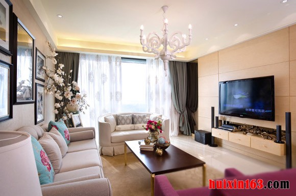 客厅中的电视背景墙选用了原木材质的装饰板材进行设计,素雅的色彩不需要多余的装饰也能将大气与时尚感展现出来,电视下方的格架设计可以为客厅增加收纳空间,既可以起到装饰作用又比较实用,非常符合本套房屋装修的风格,平顶式的石膏板的吊顶上没有过多的造型设计,只是在中间安装了一盏象牙色的吊灯,灯的款式宛若烛台,柔美的曲线勾勒出别致的设计感,更是为客厅增添了一丝异国风情的浪漫之意。一款白色的布艺沙发质地柔软搭配上淡蓝色的抱枕更显舒适、温馨,背景墙上几组随意悬挂的相框也起到了一定的装饰作用,黑色的线条更是描绘出了时尚的主题。