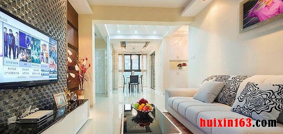 本套房屋设计比较具有时尚感,一进到房间最先吸引我们的便是电视背景墙的设计,具有金属色泽的马赛克瓷砖铺贴了整个墙壁,搭配上石膏板吊顶上镶嵌的射灯,显得更加明亮具有设计感,吊顶的造型与之相比则会显得比较简单,中间一盏带有黑色灯罩的灯饰在白色吊顶的衬托下显得更加典雅别致,一款白色的沙发靠墙而放,长条的设计显得更加大气,白色的抱枕上带有黑色纹路的花纹,整体效果会显得非常精致、唯美,沙发背景墙上则悬挂了一幅业主的婚纱照,更是为客厅平添了几分爱意,照片在射灯的照射下也显得更加温馨浪漫。落地窗前悬挂了一套蕾丝窗帘,当阳光透进来时会为客厅增添一丝朦胧感,让客厅显得更加温馨。
