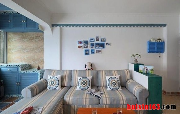 本套房屋设计属于地中海风格,房屋的主色调是以蓝色和白色为主,平顶式的石膏板吊顶造型简单,没有过多的设计手法,只是在中间悬挂了一盏别致的铁艺灯饰,白色的灯罩上带有淡淡的碎花图案在灯光的照射下显得更加雅致、唯美,电视背景墙的装饰比较具有特色,没有特殊的造型设计,而是采用了现代比较流行的一种装修手法,使用了彩绘艺术,湛蓝的海边景象,可以带给人们无限的遐想,也可以带给人们一个静谧的空间,尤其是在炎热的夏天,在视觉效果上可以带给人们一种清爽感,这样的设计不仅是具有新鲜感,更是与本套房屋的主题相符合。