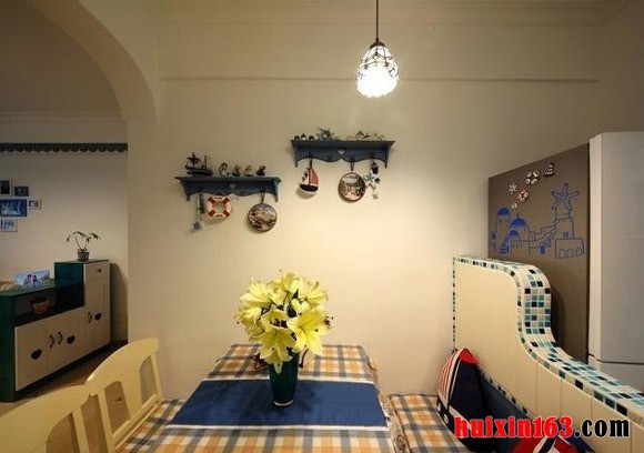 本套房屋设计属于地中海风格,房屋的主色调是以蓝色和白色为主,平顶式的石膏板吊顶造型简单,没有过多的设计手法,只是在中间悬挂了一盏别致的铁艺灯饰,白色的灯罩上带有淡淡的碎花图案在灯光的照射下显得更加雅致、唯美,电视背景墙的装饰比较具有特色,没有特殊的造型设计,而是采用了现代比较流行的一种装修手法,使用了彩绘艺术,湛蓝的海边景象,可以带给人们无限的遐想,也可以带给人们一个静谧的空间,尤其是在炎热的夏天,在视觉效果上可以带给人们一种清爽感,这样的设计不仅是具有新鲜感,更是与本套房屋的主题相符合。