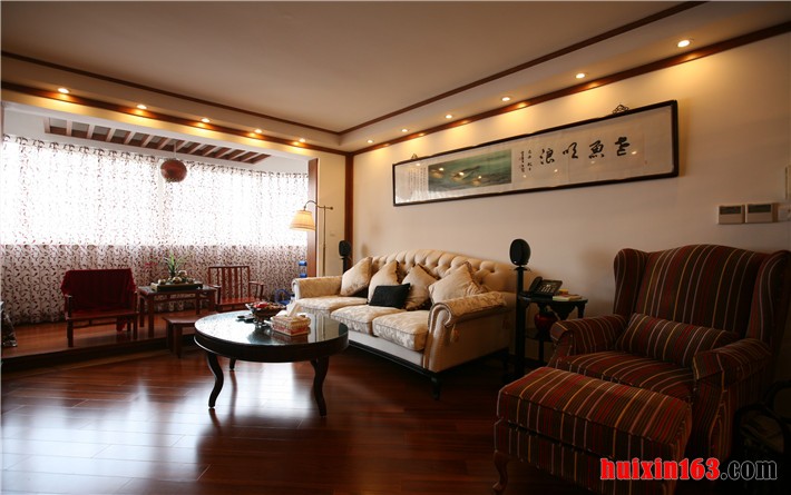 客厅中的石膏板吊顶采用了平顶式的设计,并在四周使用了装饰木条做了圈边处理,双层的设计可以使客厅装饰看起来更加具有层次感,四周射灯的设计更是亮点简约、硬朗的线条搭配上小巧别致的射灯,这正是将古典与现代相结合的设计产物,电视背景墙的装饰非常简单,深色的壁纸没有过多的装饰电视下方一个小矮柜,可以增加客厅的收纳空间还可以起到一定的装饰作用,一款造型独特的茶几摆放在沙发中间,实木烤漆材质将其典雅韵味展现的淋漓尽致,搭配上白色的皮质沙发更是凸显出了房屋主人的品味。