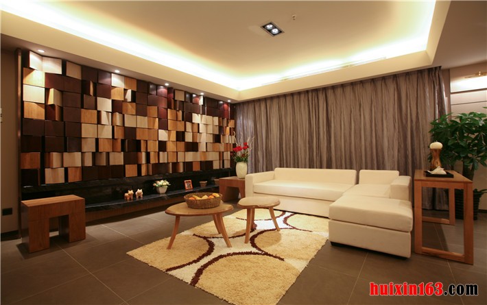 本套房屋的设计比较具有个性,一款纯白色的沙发靠窗而放,棱角分明的设计搭配上靓丽的色彩使其沙发显得更加高雅,一侧墙壁上凹凸不一的木块设计是最吸引我们的地方,别致的造型搭配上时尚的色彩更是可以凸显出本套房屋的设计理念,沙发前方摆放了两个大小不一却是同一款式的木质茶几,原木材质的设计更可以凸显其质感。开放式的厨房与餐厅相连,这样时尚的设计与本套房屋装修的理念十分相符,简约中又可以透露出时尚,非常适合年轻人居住。