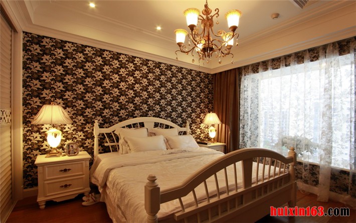 本套房屋设计中的客厅装饰比较富有华丽色彩,最吸引人目光的便是格子状的石膏板吊顶,在吊顶的夹层中安装了一圈暖黄色的灯带,将吊顶衬托的更加别致、时尚,中间镶嵌的一盏铁艺吊灯,造型唯美,曲线婉柔,宛若一件精致的工艺品,在吊顶的衬托下显得更加独特。宽大的落地窗前悬挂了双层窗帘,一层轻质薄纱在日光的照射下可以为客厅带来一丝朦胧感,厚重的布艺窗帘则会为业主带来一个私密空间,可以不受外界的打扰,电视背景墙的两侧做了罗马柱的造型设计,中间部分则粘贴了带有碎花图案的壁纸,素雅的花纹并不张扬,在人们长期观看电视的情况下也不会刺激双眼。