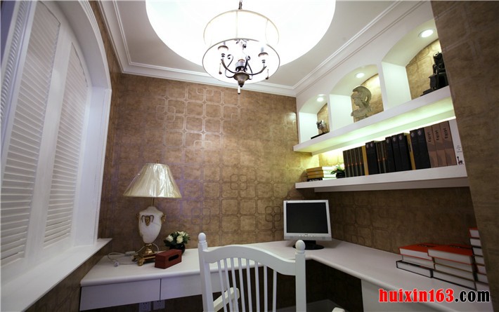 本套房屋设计中的客厅装饰比较富有华丽色彩,最吸引人目光的便是格子状的石膏板吊顶,在吊顶的夹层中安装了一圈暖黄色的灯带,将吊顶衬托的更加别致、时尚,中间镶嵌的一盏铁艺吊灯,造型唯美,曲线婉柔,宛若一件精致的工艺品,在吊顶的衬托下显得更加独特。宽大的落地窗前悬挂了双层窗帘,一层轻质薄纱在日光的照射下可以为客厅带来一丝朦胧感,厚重的布艺窗帘则会为业主带来一个私密空间,可以不受外界的打扰,电视背景墙的两侧做了罗马柱的造型设计,中间部分则粘贴了带有碎花图案的壁纸,素雅的花纹并不张扬,在人们长期观看电视的情况下也不会刺激双眼。