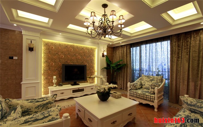 本套房屋设计中的客厅装饰比较富有华丽色彩,最吸引人目光的便是格子状的石膏板吊顶,在吊顶的夹层中安装了一圈暖黄色的灯带,将吊顶衬托的更加别致、时尚,中间镶嵌的一盏铁艺吊灯,造型唯美,曲线婉柔,宛若一件精致的工艺品,在吊顶的衬托下显得更加独特。宽大的落地窗前悬挂了双层窗帘,一层轻质薄纱在日光的照射下可以为客厅带来一丝朦胧感,厚重的布艺窗帘则会为业主带来一个私密空间,可以不受外界的打扰,电视背景墙的两侧做了罗马柱的造型设计,中间部分则粘贴了带有碎花图案的壁纸,素雅的花纹并不张扬,在人们长期观看电视的情况下也不会刺激双眼。
