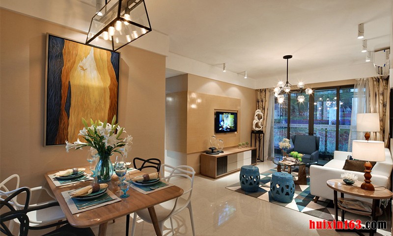 本案例的设计当中,通过设计师灵活的色彩搭配,营造出一种富有创意的居室环境,并且恰到好处的几何图案添加,更是呈现出一种充满美感的效果,同时也给出很大的视觉冲击,在客厅的设计当中,采用平顶式的石膏板吊顶,背景色彩以白色为主,与洁白的地砖上下相互呼应,开放式的餐厅设计,其吊顶与客厅的吊顶相互连接,在视觉效果上更是给人一种浑然一体的感觉,推拉门的设计与室外相连接,其景观与室内正好起到一个相互借景的效果,反观餐厅的设计,所占据的空间面积并不是很大,但却显得比较新颖,个性别致的餐具摆放,餐桌上一束百合花的添加,正好起到一个锦上添花的效果。