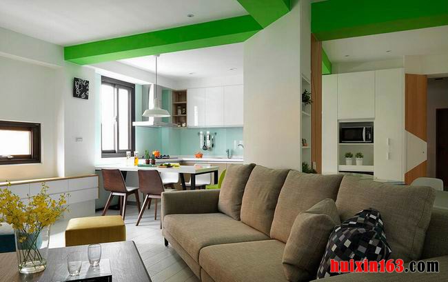 本套房屋设计中可以带给人们一种不规则的时尚感,一进到房间我们首先便会被石膏板吊顶上的绿色梁条所吸引,鲜嫩的绿色一定会为我们带来一丝新鲜感,同时它也起到了一定的点缀作用,一款棉麻材质的沙发摆放在电视对面,这样比较方便人们观看电视,距离适中,既可以让人们清楚的观看电视,又可以保护人们的眼睛,电视背景墙的设计比较简单,没有复杂的造型设计,却可以带给人们一种舒适感,开放式的厨房与餐厅相连,时尚的格局设计更加符合本套房屋装饰的主题,简洁中又带有一丝时尚的气息,不规则的设计更加凸显了设计感,非常符合年轻人居住。