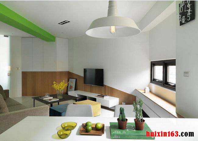 本套房屋设计中可以带给人们一种不规则的时尚感,一进到房间我们首先便会被石膏板吊顶上的绿色梁条所吸引,鲜嫩的绿色一定会为我们带来一丝新鲜感,同时它也起到了一定的点缀作用,一款棉麻材质的沙发摆放在电视对面,这样比较方便人们观看电视,距离适中,既可以让人们清楚的观看电视,又可以保护人们的眼睛,电视背景墙的设计比较简单,没有复杂的造型设计,却可以带给人们一种舒适感,开放式的厨房与餐厅相连,时尚的格局设计更加符合本套房屋装饰的主题,简洁中又带有一丝时尚的气息,不规则的设计更加凸显了设计感,非常符合年轻人居住。