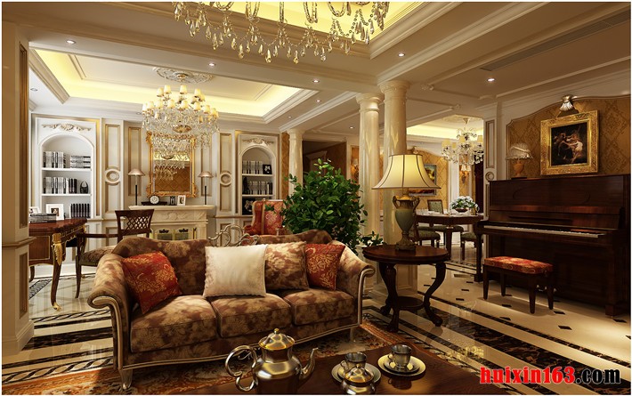 本套房屋装饰在整体效果上比较大气,客厅中使用了罗马柱做造型设计,石膏板吊顶上则采用了平顶式的设计,四周的夹层处安装了暖黄色的灯带做装饰,柔和的灯光可以为客厅带来一丝温馨之意,吊顶中间部分做了精致的雕花工艺设计,并在上面安装了一盏水晶吊灯,水晶吊坠低垂,在灯光的映射下显得更加晶莹剔透,也将石膏板造型衬托的更加精美,电视背景墙上使用了黄色带有素雅花纹的壁纸做装饰,两侧依然是罗马柱的造型设计,更是为本套房屋装饰增添了些许的异国风情味道,地面上的拼花大理石设计,也为本套房屋装修增添了不少设计感,卧室中的装饰设计比较实用,将一侧的墙壁做了格架设计,可以摆放书籍,书架的造型也起到了一定的装饰效果,这样的设计也为卧室增添了不少书香之气。