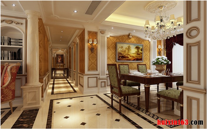 本套房屋装饰在整体效果上比较大气,客厅中使用了罗马柱做造型设计,石膏板吊顶上则采用了平顶式的设计,四周的夹层处安装了暖黄色的灯带做装饰,柔和的灯光可以为客厅带来一丝温馨之意,吊顶中间部分做了精致的雕花工艺设计,并在上面安装了一盏水晶吊灯,水晶吊坠低垂,在灯光的映射下显得更加晶莹剔透,也将石膏板造型衬托的更加精美,电视背景墙上使用了黄色带有素雅花纹的壁纸做装饰,两侧依然是罗马柱的造型设计,更是为本套房屋装饰增添了些许的异国风情味道,地面上的拼花大理石设计,也为本套房屋装修增添了不少设计感,卧室中的装饰设计比较实用,将一侧的墙壁做了格架设计,可以摆放书籍,书架的造型也起到了一定的装饰效果,这样的设计也为卧室增添了不少书香之气。