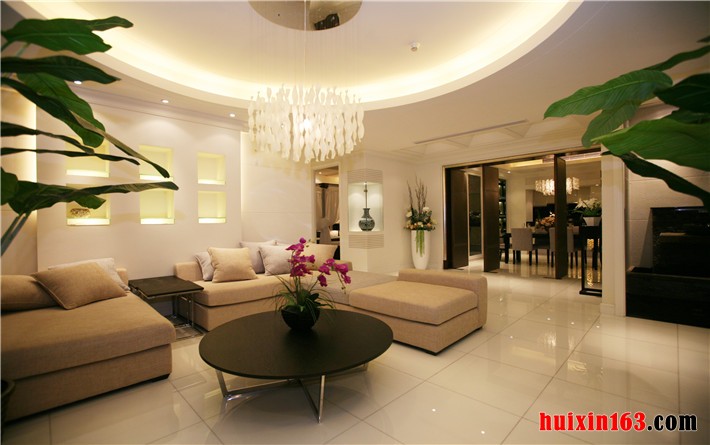 本套房屋的装饰风格比较注重华丽色彩,客厅中的石膏板吊顶上做了圆形的造型设计,并在中间安装了一盏圆形的水晶吊灯,吊坠低垂,在四周白色灯带的映衬下显得更加华丽、唯美,沙发背景墙没有过于复杂的造型设计,只是做了格架设计,可以摆放一些精致的工艺品,也可以为客厅增加收纳空间,沙发中间摆放了一款黑色圆形的茶几,简单的设计却颇具大气与时尚感,与本套房屋的装饰风格十分相符。客厅中大量的使用了绿植做装饰,可以为空间增添一丝清新感,绿色的植物也可以在靓丽的空间中起到一定的点缀作用,为房屋装修增加一定的设计感。