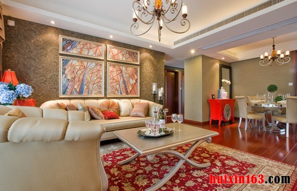 本套房屋的客厅装饰比较具有现代风格,色彩素雅的壁纸装饰着墙壁,暗淡的色彩并不会带给人们一种压抑感,反而是将气氛衬托的更加典雅,一款米白色的皮质沙发靠墙而放,中间则摆放了一款银灰色的茶几,简单、大方的造型搭配上时尚、高雅的色彩更是凸显了本套房屋装饰的主题,地面上则搭配了一款红黄相间的局部地毯,为房屋增添了一丝温馨的氛围,平顶式的石膏板吊顶上没有过于复杂的造型,展现在我们面前的反而是一种大气之势,餐厅中的装饰比较具有时尚色彩,餐桌的边框做了金属圈边处理,搭配上白色皮质的座椅整体搭配使餐厅空间显得更加高雅、靓丽。