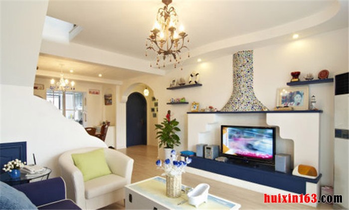 地中海风格的房屋装修可以带给我们一种纯美与浪漫之意,本套房屋便是典型的地中海装修风格,一进到房屋首先映入我们眼帘的便是餐厅空间,餐厅中一侧的墙壁上安装了带有菱形图案的镜面装饰,搭配上石膏板吊顶上的水晶吊灯,使餐厅空间显得更加明亮通透,在视觉效果上也起到了扩大空间的效果,一套实木材质的餐桌与座椅也在这样的空间下显得更加高档、典雅,客厅中的装饰主要是以白色为主,使用了蓝色做点缀色彩,电视背景墙上的造型比较简单,电视上方做了格架的造型设计,可以在格架上摆放一些精致的装饰品,电视下方则是低矮的柜子,也可以增加客厅的收纳空间,这样的设计不仅时尚也非常实用,比较符合现代房屋装修的主题。