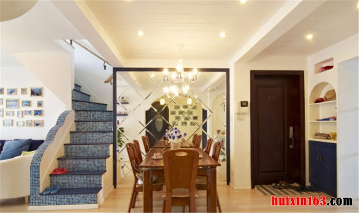 地中海风格的房屋装修可以带给我们一种纯美与浪漫之意,本套房屋便是典型的地中海装修风格,一进到房屋首先映入我们眼帘的便是餐厅空间,餐厅中一侧的墙壁上安装了带有菱形图案的镜面装饰,搭配上石膏板吊顶上的水晶吊灯,使餐厅空间显得更加明亮通透,在视觉效果上也起到了扩大空间的效果,一套实木材质的餐桌与座椅也在这样的空间下显得更加高档、典雅,客厅中的装饰主要是以白色为主,使用了蓝色做点缀色彩,电视背景墙上的造型比较简单,电视上方做了格架的造型设计,可以在格架上摆放一些精致的装饰品,电视下方则是低矮的柜子,也可以增加客厅的收纳空间,这样的设计不仅时尚也非常实用,比较符合现代房屋装修的主题。