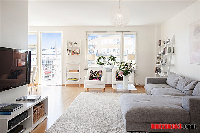 本套房屋的装饰主色彩以白色为主,客厅中则选择搭配了一款淡灰色的棉麻布艺沙发,柔软舒适的材质可以带给人们一种舒适感,地面上则搭配了一款白色的毛绒地毯,干净的色彩可以为房屋增添一丝温馨之意,沙发中间的地面上摆放了一款钢化玻璃材质的茶几,小巧的造型设计,上面摆放了一款造型简单的白色花瓶,里面插放了新鲜的百合花卉,不仅可以起到一定的装饰效果,更可以使房间中充满清新的味道,可以使人们的身心感到无比的放松,电视背景墙上没有过于复杂的造型设计,只是在电视下方摆放了一款木质矮柜,可以大大的增加客厅的收纳空间,也非常的具有设计感。