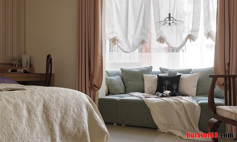 本套房屋的整体装饰风格可以带给人们一种大气的感觉,一进到客厅便会感受到大气之势,客厅中的石膏板吊顶采用了平顶式的设计,中间镶嵌的一盏灯饰形如风扇,非常具有个性,客厅中沙发布局形式则采用了众星捧月式,自后的沙发以及沙发凳将木质茶几围在中间,更能突显出茶几的设计感,茶几上摆放了一株带有淡雅色彩的鲜花,淡淡的绿色可以为房间增添一丝清新感,也是空间内多了一丝芳香之气,卧室中的装饰特点以舒适为主,床头装饰也采用了软包装饰设计,与本套房屋装修风格十分相符,床尾处搭配了一款床尾凳,使卧室装修显得更加时尚,床尾凳的搭配也更加方便、实用。