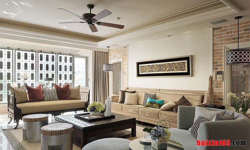 本套房屋的整体装饰风格可以带给人们一种大气的感觉,一进到客厅便会感受到大气之势,客厅中的石膏板吊顶采用了平顶式的设计,中间镶嵌的一盏灯饰形如风扇,非常具有个性,客厅中沙发布局形式则采用了众星捧月式,自后的沙发以及沙发凳将木质茶几围在中间,更能突显出茶几的设计感,茶几上摆放了一株带有淡雅色彩的鲜花,淡淡的绿色可以为房间增添一丝清新感,也是空间内多了一丝芳香之气,卧室中的装饰特点以舒适为主,床头装饰也采用了软包装饰设计,与本套房屋装修风格十分相符,床尾处搭配了一款床尾凳,使卧室装修显得更加时尚,床尾凳的搭配也更加方便、实用。