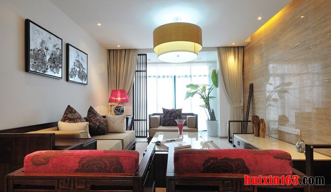 客厅中的装饰比较具有古典韵味,石膏板吊顶上虽然采用了平顶式的设计,但并不会带给人们一种单调的感觉,中间安装的仿古灯饰采用了圆形的灯罩设计,电视背景墙没有过于复杂的造型设计只是使用了人造石做装饰,但整体会带给人们一种非常大气的视觉效果,与之相对的沙发背景墙装饰亦是如此,只是在墙面上悬挂了两幅装饰画,黑白的色彩搭配并没有带给人们一种惊艳的感觉,但这样的色彩搭配却也恰到好处,正与本套房屋的装修效果相符,沙发的款式更是具有古典韵味色彩,实木材质的边框搭配上柔软舒适的做垫与靠垫更加具有设计感,一侧的沙发凳上选用了红色的靠垫更是成为了客厅中的一抹点缀色彩。