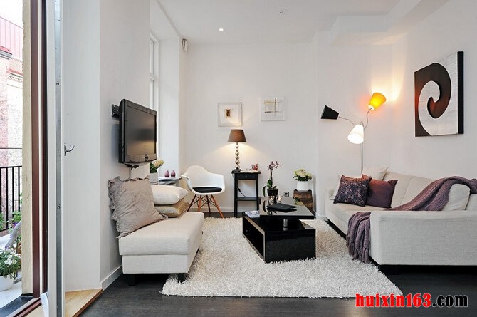 本套房屋装饰的主色彩主要是以白色为主,客厅中的装饰并没有华丽的装饰,主要是以黑白两色为主,一款纯白色的棉质布艺沙发搭配上一款黑色小巧的茶几显得十分具有个性,茶几分为上下两层,这样的设计更加具有实用价值,地面上铺设了一款白色的毛绒地毯,楼可以为客厅空间平添一丝温馨与浪漫之意,本套房屋设计中阳台的的装饰比较吸引人,铁艺的围栏搭配上诸多的绿植鲜花,没有固定的排序,试试随意的摆放、搭配,却可以带给人们一种舒适感,在这样富有浪漫色彩的空间,与客厅黑白相间的色彩搭配形成了鲜明的对比,在阳台的一侧摆放上一套茶几与座椅,便可以在这里惬意的享受午后休息时光。