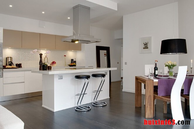 本套房屋装饰的主色彩主要是以白色为主,客厅中的装饰并没有华丽的装饰,主要是以黑白两色为主,一款纯白色的棉质布艺沙发搭配上一款黑色小巧的茶几显得十分具有个性,茶几分为上下两层,这样的设计更加具有实用价值,地面上铺设了一款白色的毛绒地毯,楼可以为客厅空间平添一丝温馨与浪漫之意,本套房屋设计中阳台的的装饰比较吸引人,铁艺的围栏搭配上诸多的绿植鲜花,没有固定的排序,试试随意的摆放、搭配,却可以带给人们一种舒适感,在这样富有浪漫色彩的空间,与客厅黑白相间的色彩搭配形成了鲜明的对比,在阳台的一侧摆放上一套茶几与座椅,便可以在这里惬意的享受午后休息时光。