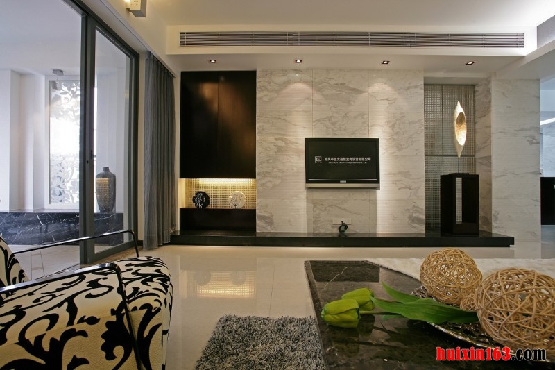 客厅中的电视背景墙采用了白色带有仿天然纹路的人造石做装饰,虽然没有复杂的造型也没有艳丽的色彩,但背景墙也显得十分高档、大气,背景墙两侧都做了摆放了一些具有特色的装饰品,不仅可以起到一定的装饰作用,还可以凸显出房屋主人的品味,与之相对的沙发背景墙则装饰简单,只是悬挂了一幅比较长的装饰画做装饰,一款黑色的皮质沙发更是显高档,搭配上银色的抱枕则是凸显出了时尚感,中间摆放的茶几造型独特,颇具设计感,石膏板吊顶上没有过于复杂的造型装饰,更没有太过多余的装饰灯饰,这样简洁的设计与本套房屋的装修主题十分相符。