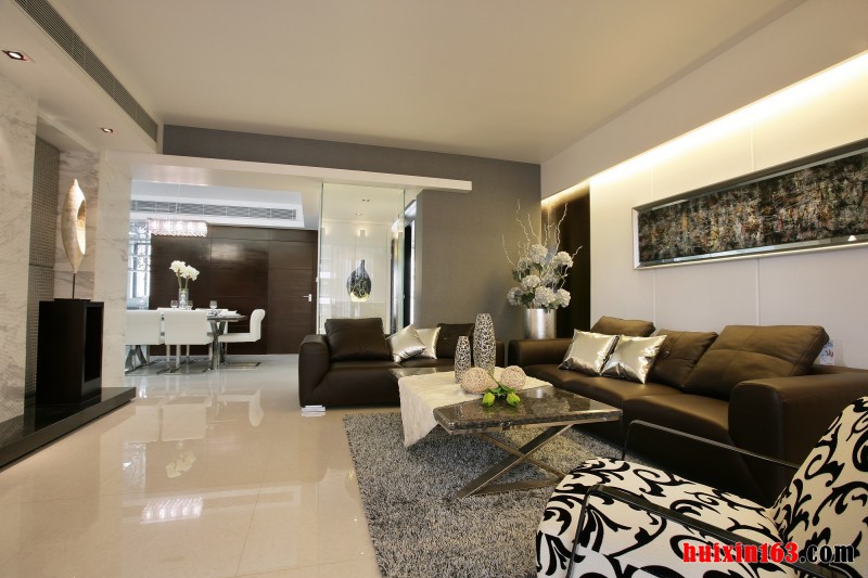 客厅中的电视背景墙采用了白色带有仿天然纹路的人造石做装饰,虽然没有复杂的造型也没有艳丽的色彩,但背景墙也显得十分高档、大气,背景墙两侧都做了摆放了一些具有特色的装饰品,不仅可以起到一定的装饰作用,还可以凸显出房屋主人的品味,与之相对的沙发背景墙则装饰简单,只是悬挂了一幅比较长的装饰画做装饰,一款黑色的皮质沙发更是显高档,搭配上银色的抱枕则是凸显出了时尚感,中间摆放的茶几造型独特,颇具设计感,石膏板吊顶上没有过于复杂的造型装饰,更没有太过多余的装饰灯饰,这样简洁的设计与本套房屋的装修主题十分相符。