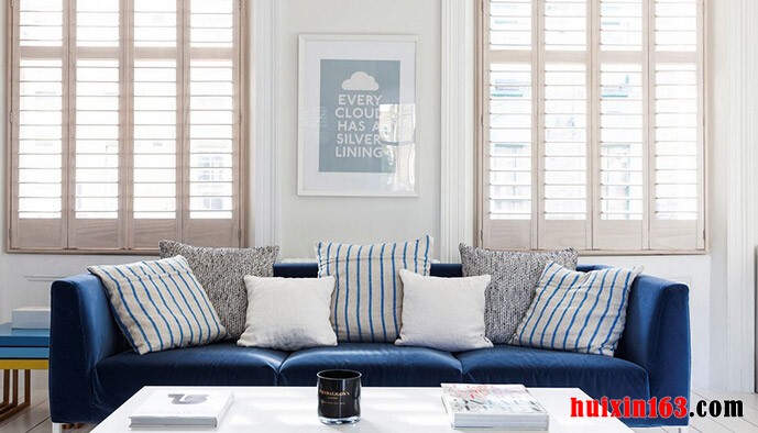 本套房屋装饰的色彩主要是以白色和蓝色为主,客厅中的装饰比较素朴,没有夸张的造型设计,也没有华丽的色彩搭配,白色的空间内没有跟多的点缀,只是靠窗摆放了一款蓝色的毛绒沙发,柔软舒适的沙发上搭配了蓝白相间的布艺抱枕,整体效果可以带给人们一种非常轻松舒适的感觉,沙发中间则摆放了一款白色的小巧茶几,小巧的茶几却可以为客厅空间增加很多的收纳空间,是一款比较实用的家具,沙发一侧的墙壁上做出了书架的设计,可以让业主摆放一些书籍,也可以摆放一些装饰品,增添客厅的装饰也可以使客厅中充满书香的芬芳,与之相对的墙壁上则安装了一面镜面装饰,可以在视觉上起到扩大空间的效果。