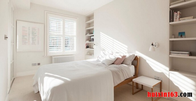 本套房屋装饰的色彩主要是以白色和蓝色为主,客厅中的装饰比较素朴,没有夸张的造型设计,也没有华丽的色彩搭配,白色的空间内没有跟多的点缀,只是靠窗摆放了一款蓝色的毛绒沙发,柔软舒适的沙发上搭配了蓝白相间的布艺抱枕,整体效果可以带给人们一种非常轻松舒适的感觉,沙发中间则摆放了一款白色的小巧茶几,小巧的茶几却可以为客厅空间增加很多的收纳空间,是一款比较实用的家具,沙发一侧的墙壁上做出了书架的设计,可以让业主摆放一些书籍,也可以摆放一些装饰品,增添客厅的装饰也可以使客厅中充满书香的芬芳,与之相对的墙壁上则安装了一面镜面装饰,可以在视觉上起到扩大空间的效果。